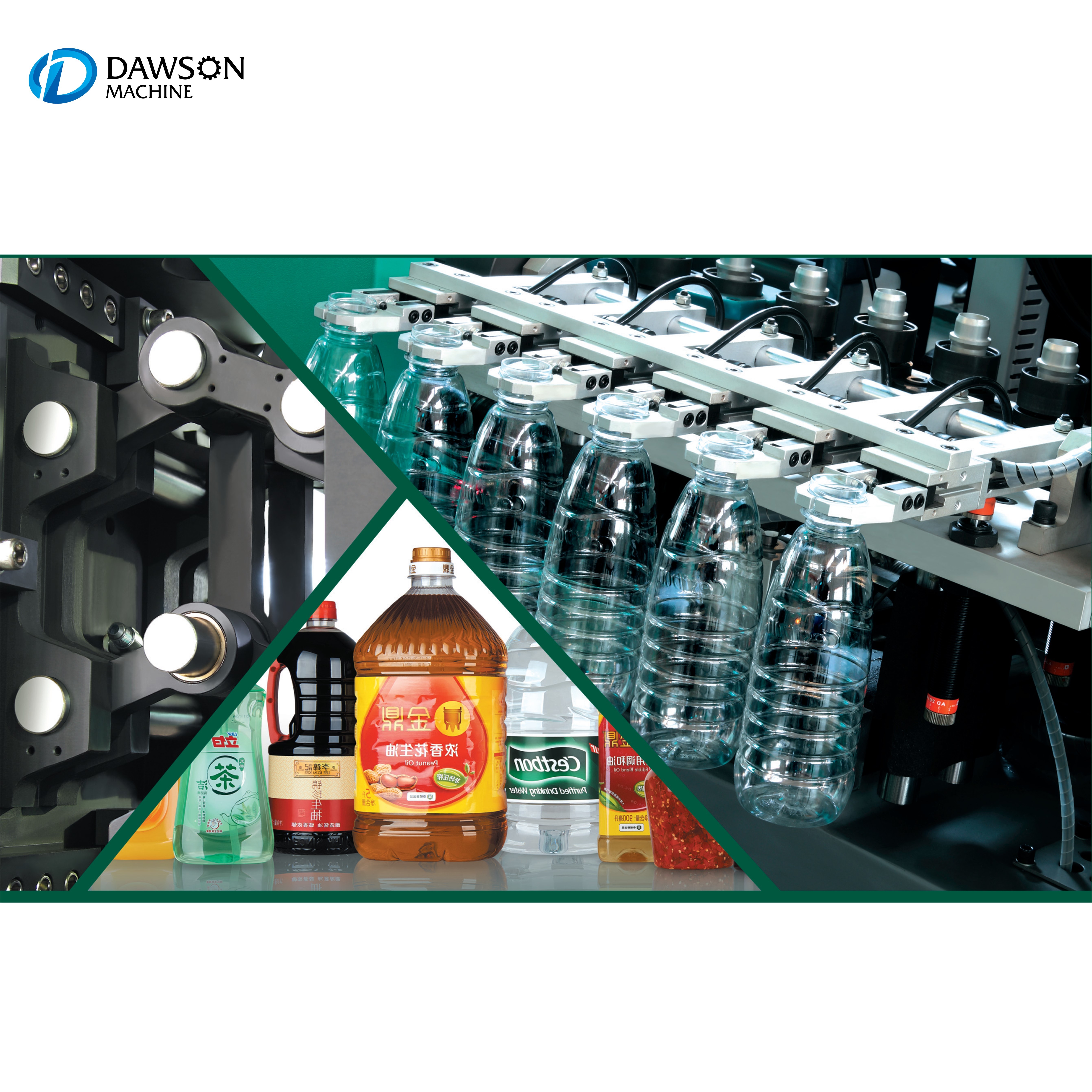 Принимать систему сервоуправления, и структура являются стабильными и надежными, высокой скоростью и плавным, легкое обслуживание. Форма очень гибкая, которая может удовлетворить потребности непрерывного производства.Контроль и регулировка температуры с помощью сенсорного экрана упростили регулировку температуры для различных раздуваний бутылок.
